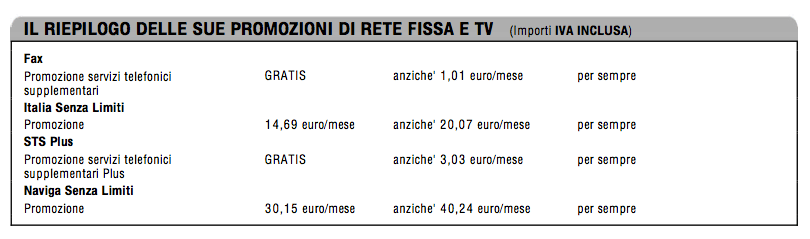 Ma torniamo all’offerta. Io ero preocupato che, anche se dettato da superiori motivi amministrativi, il cambiamento di contratto mi togliesse delle cose che mi servivano o che andassi a pagare di più. Avevo il Fax gratis nel mio per-sempre anzichè pagarlo 1.01€/mese, il servizio Chi-chiama per vedere il numero del chiamante, quattro ore di indirizzo IP Pubblico che usavo per fare prove delle mie realizzazioni hobbistiche, un ADSL Flat e telefonate gratis. Mi dissero che non sarebbe cambiato nulla, con la stessa cifra avrei avuto gli stessi servizi.