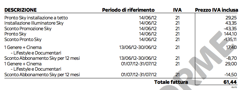 e che fosse gratuita la trovo addebitata per 144,10€ e scontata di 135,11€ ossia la pago 8,99€. Poi, smentendo quanto riportato nel sito, mi viene addebitato a parte il prezzo ProntoSky nstallazione a tetto per 29,25€. Poi mi addebitano ilcosto dell’illuminatore che viene azzerato da un non meglio identificato Sconto Promozione Sky. Morale: tra le voci sommate in fattura e gli sconti detratti, invece che essere gratis pago 38,24€.