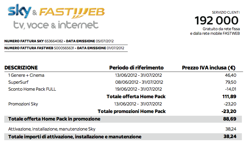 Un po’ di tempo fa, era Giugno del 2012, mi chiamano da FASTWEB per farmi un’offerta speciale: in occasione della fusione ( o dell’acquisto? non ricordo) con SKY mi offrivano un pacchetto televisivo con una modalità interessante. Finalmente potevo prendere il solo pacchetto Cinema senza essere obbligato a prenderne altri. Era quello che volevo di SKY e il prezzo era giusto, anzi conveniente per i primi mesi. Però, mi dissero che, per motivi aministrativi dovevano fare un nuovo contratto per tutto, anche per la telefonia e l’ADSL.